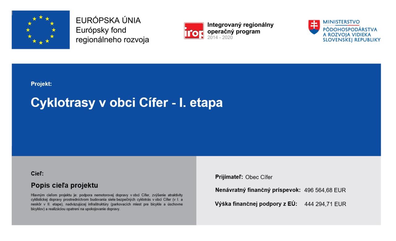 https://www.cyklocifer.sk/Názov projektu: Cyklotrasy v obci Cífer – 1. etapa (cyklochodník zo železničnej stanice Cífer, cez ulice M.R.štefánika, Bernolákova, Trnavská)