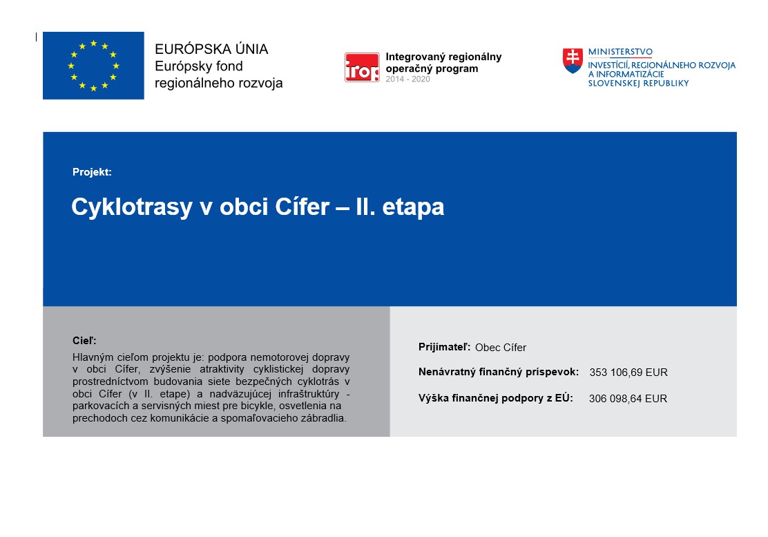 Názov projektu: Cyklotrasy v obci Cífer – 2. etapa (cyklotrasa z Trnavskej ulice, cez štátnu cestu Senec-Trnava, smerom na Pác a v miestnej časti Pác)