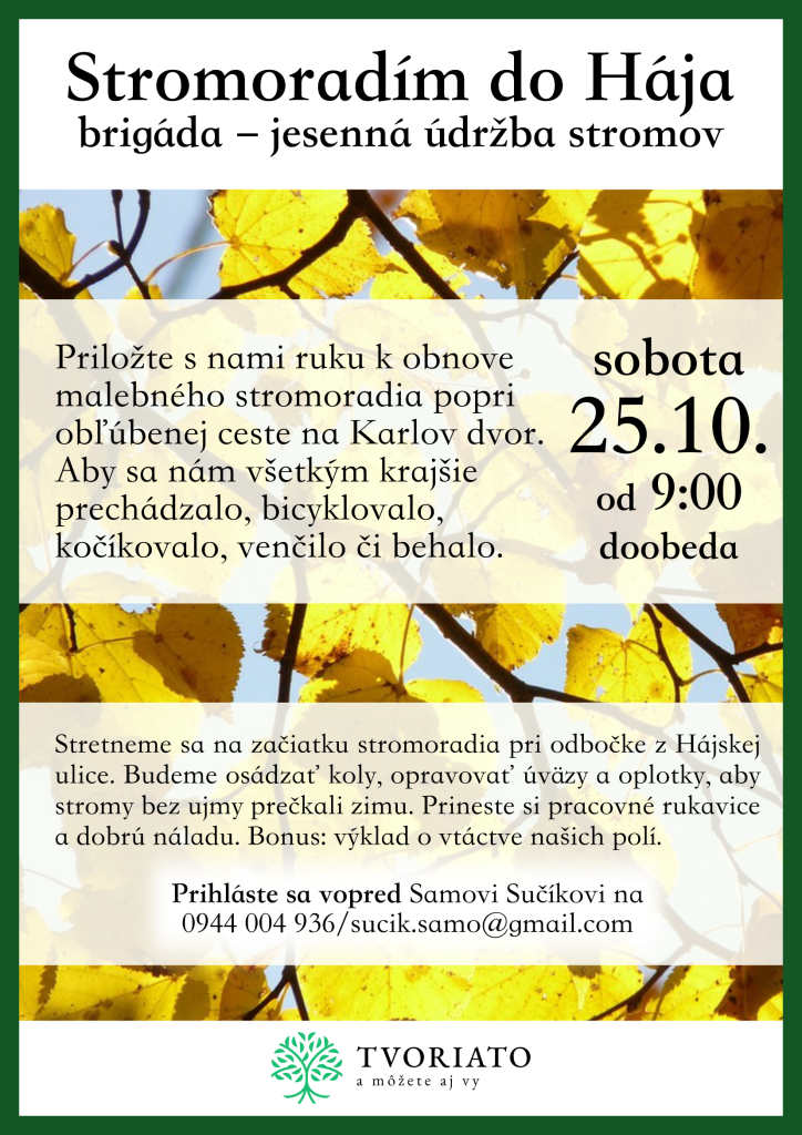 Tvoriato, o.z. Vás pozýva na brigádu - jesenná údržba stromov - Stromoradím do Hája v sobotu 25.10.2025 od 9:00.