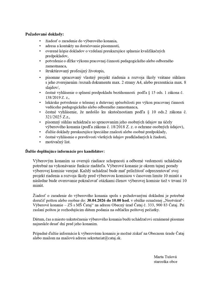 Oznam o vyhlásení výberového konania na obsadenie funkcie riaditeľa/riaditeľky ZŠ s MŠ Čataj