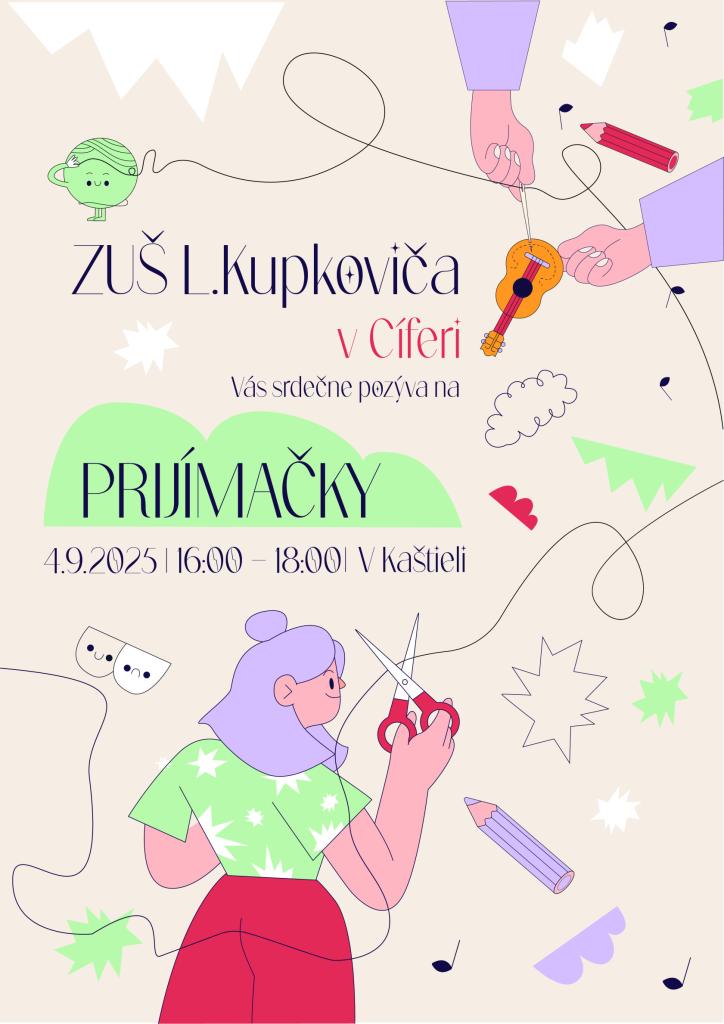 ZUŠ L. Kupkoviča v Cíferi Vás srdečne pozýva na prijímačky, ktoré sa budú konať 4.9.2025 od 16,00 do 18,00 v Kaštieli.